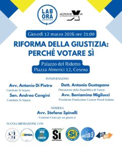 Giovedì 12 marzo 2026 ore 21:00, Palazzo del Ridotto Piazza Almerici 12, Cesena INTERVENGONO Avv. Antonio Di Pietro, Comitato Sì Separa Sen. Andrea Cangini, Comitato Sì Separa Dott.